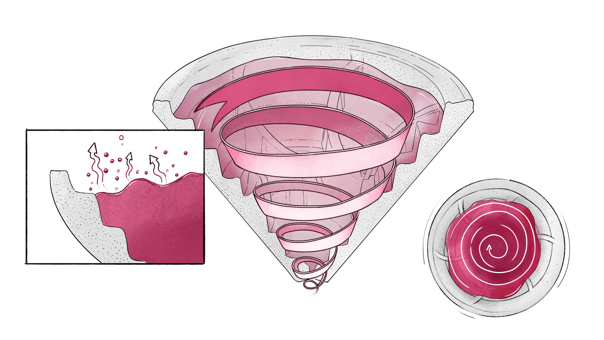 Wissenschaftliche Herausforderung war dabei die gezielte Kopplung von Druckänderungen entlang eines trichterförmigen Durchströmungsraums, lokal definierten Scherkräften an strukturierten Oberflächen sowie kontrollierten Strömungsablösungen zur Freisetzung gelöster Gase. Die helixförmige Rinnenstruktur in Kombination mit gekrümmten Leitschaufeln wurde iterativ entwickelt, um eine strömungsmechanisch stabile Drehrichtung unabhängig von Einfüllrichtung und Durchflussvariationen sicherzustellen. Parallel dazu wurde die Auslassgeometrie so ausgelegt, dass ein reproduzierbares Verhältnis aus Durchflussgeschwindigkeit und Kontaktzeit entsteht.